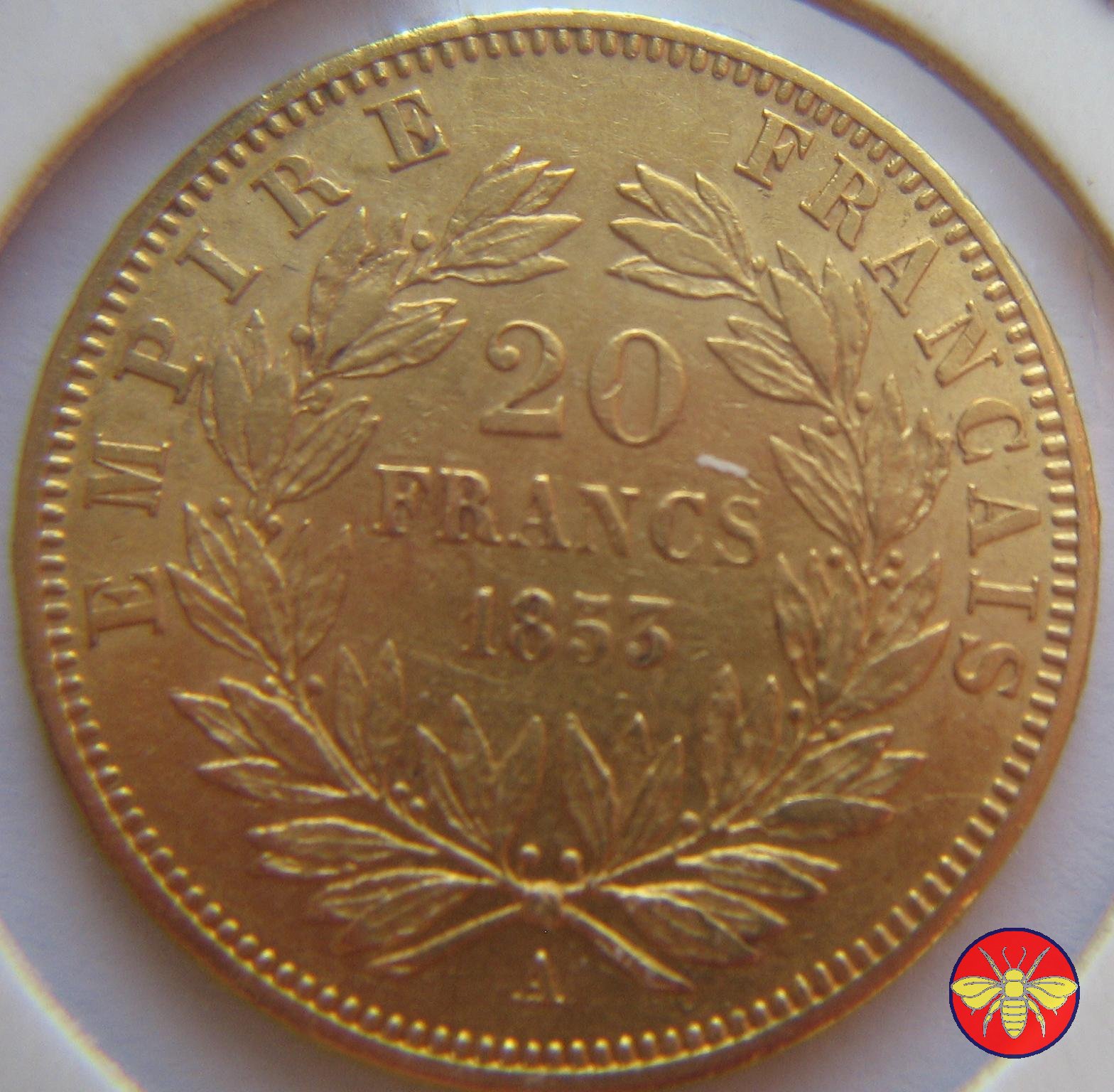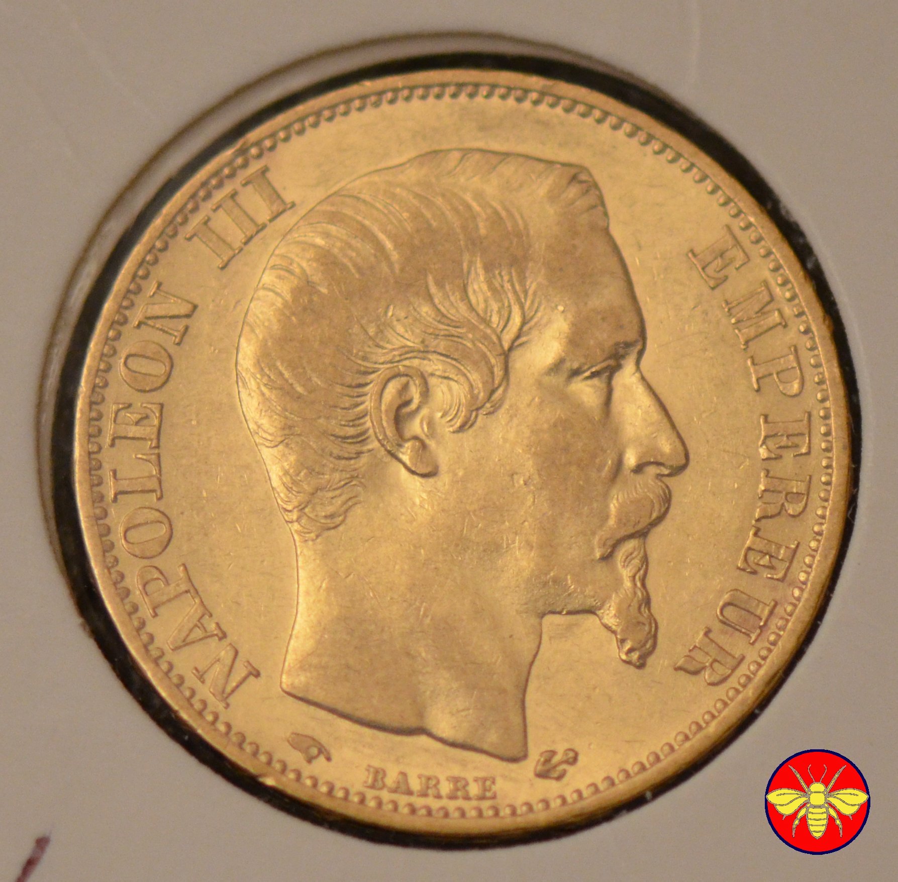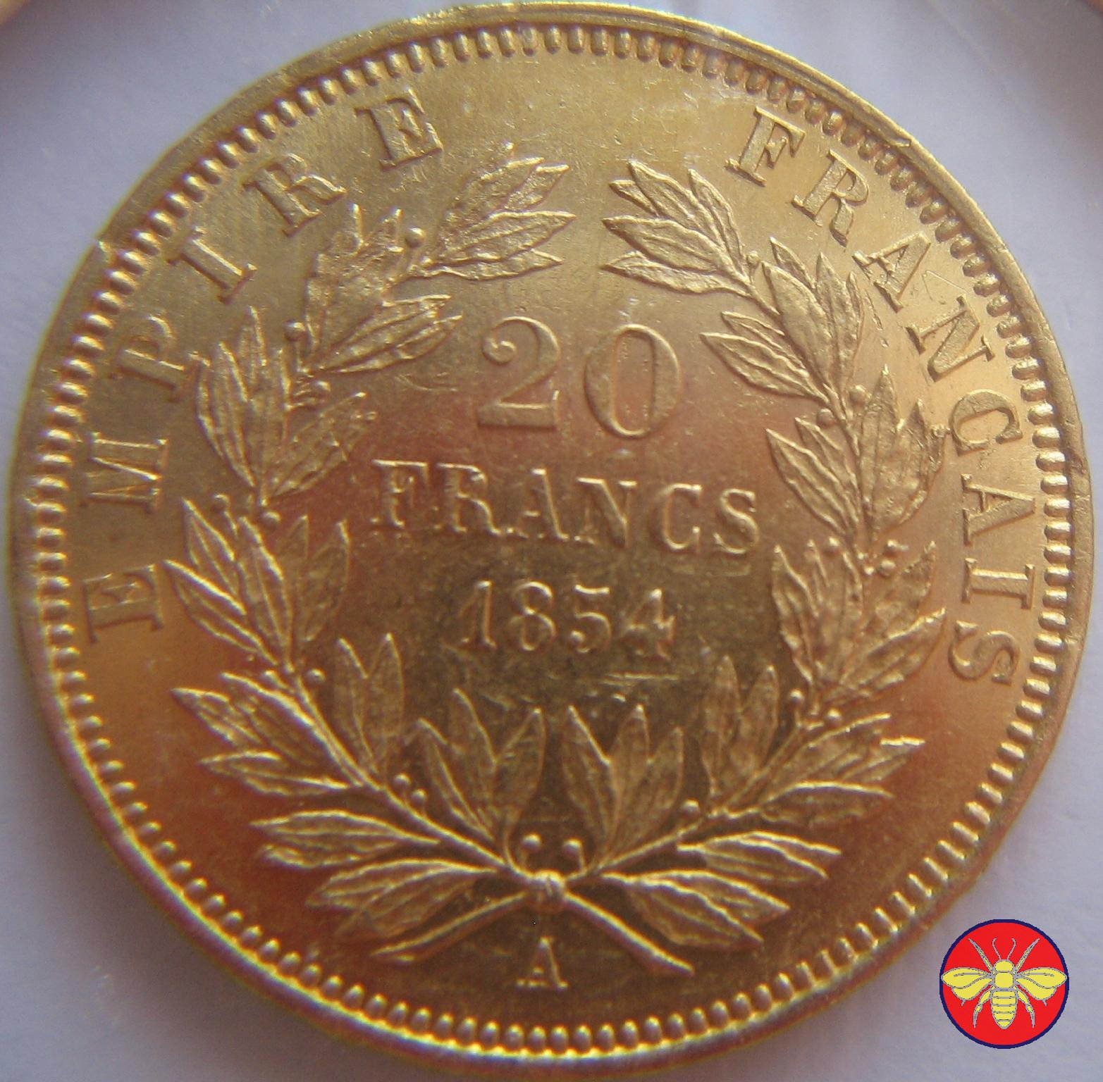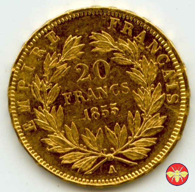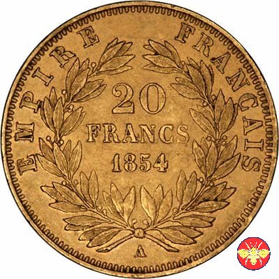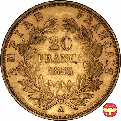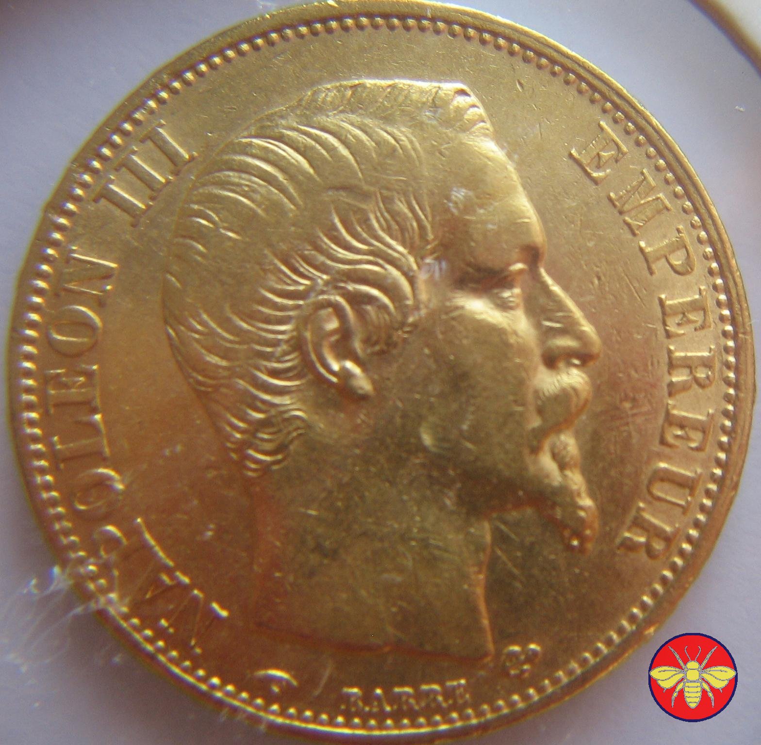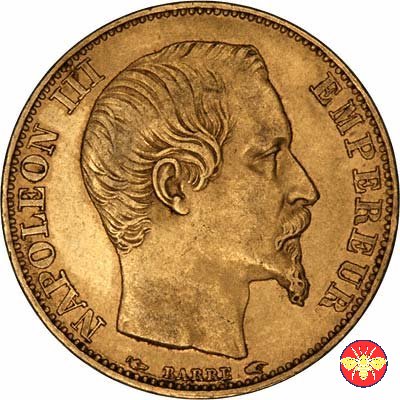 Testa nuda di Napoleone III volta verso destra. 20 FRANCS sopra e millesimo sotto fra rami di Ulivo e Quercia.