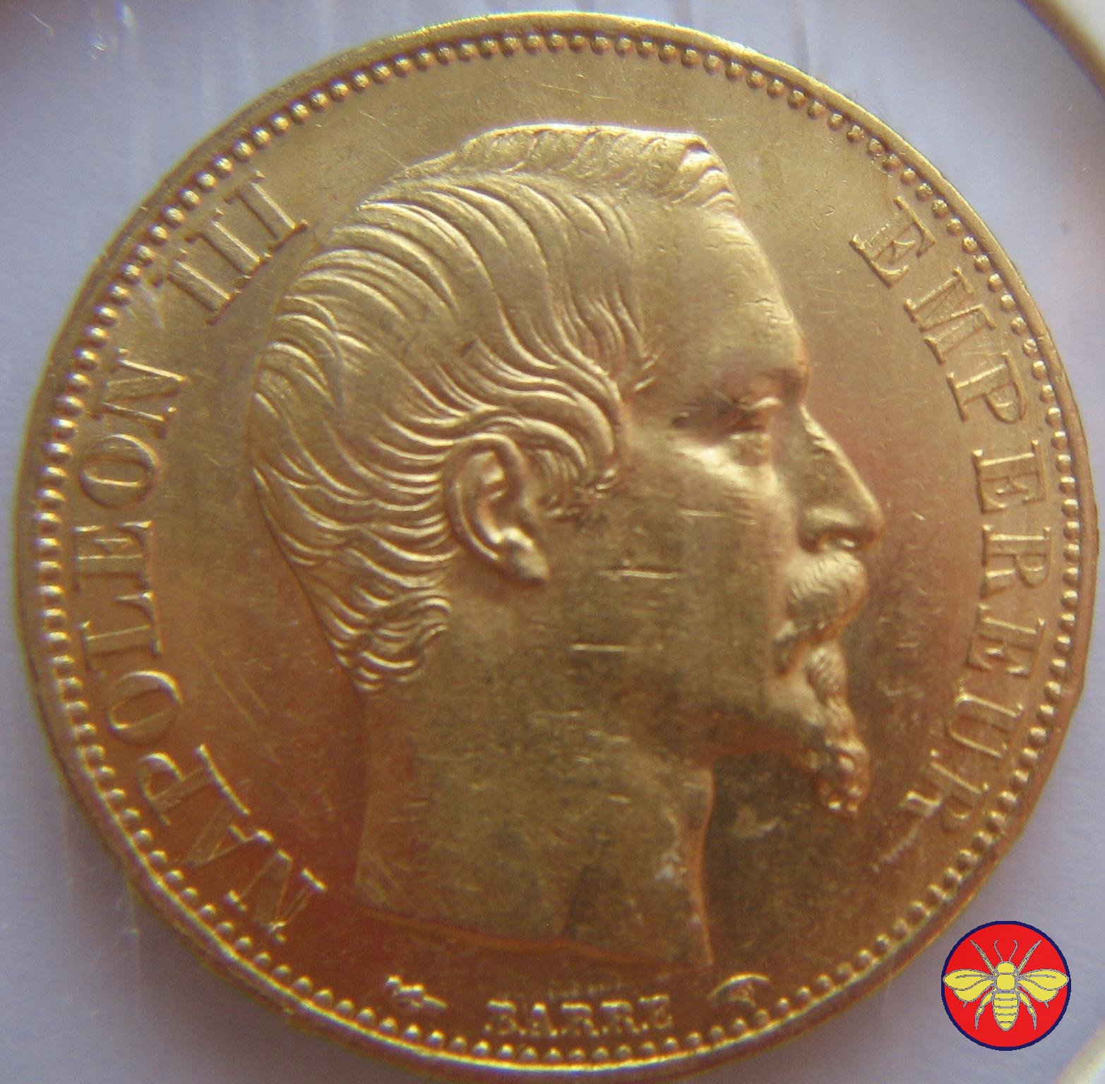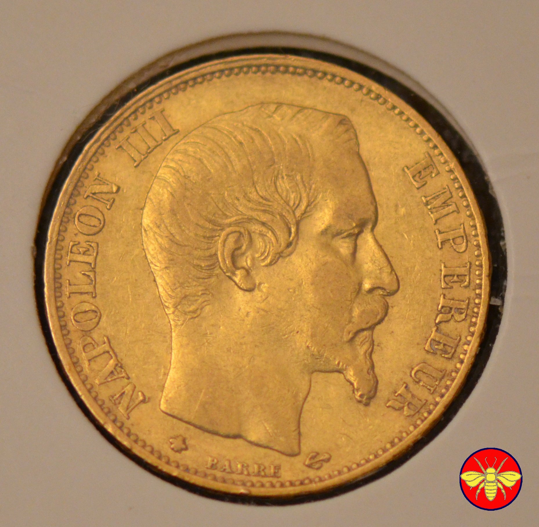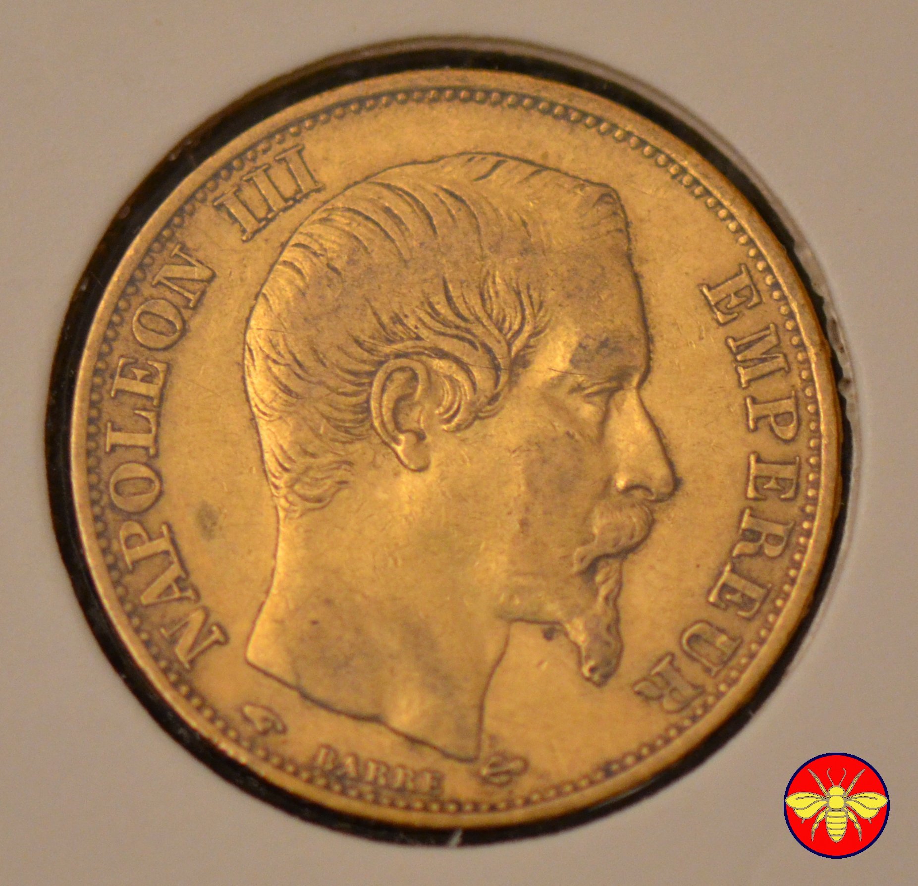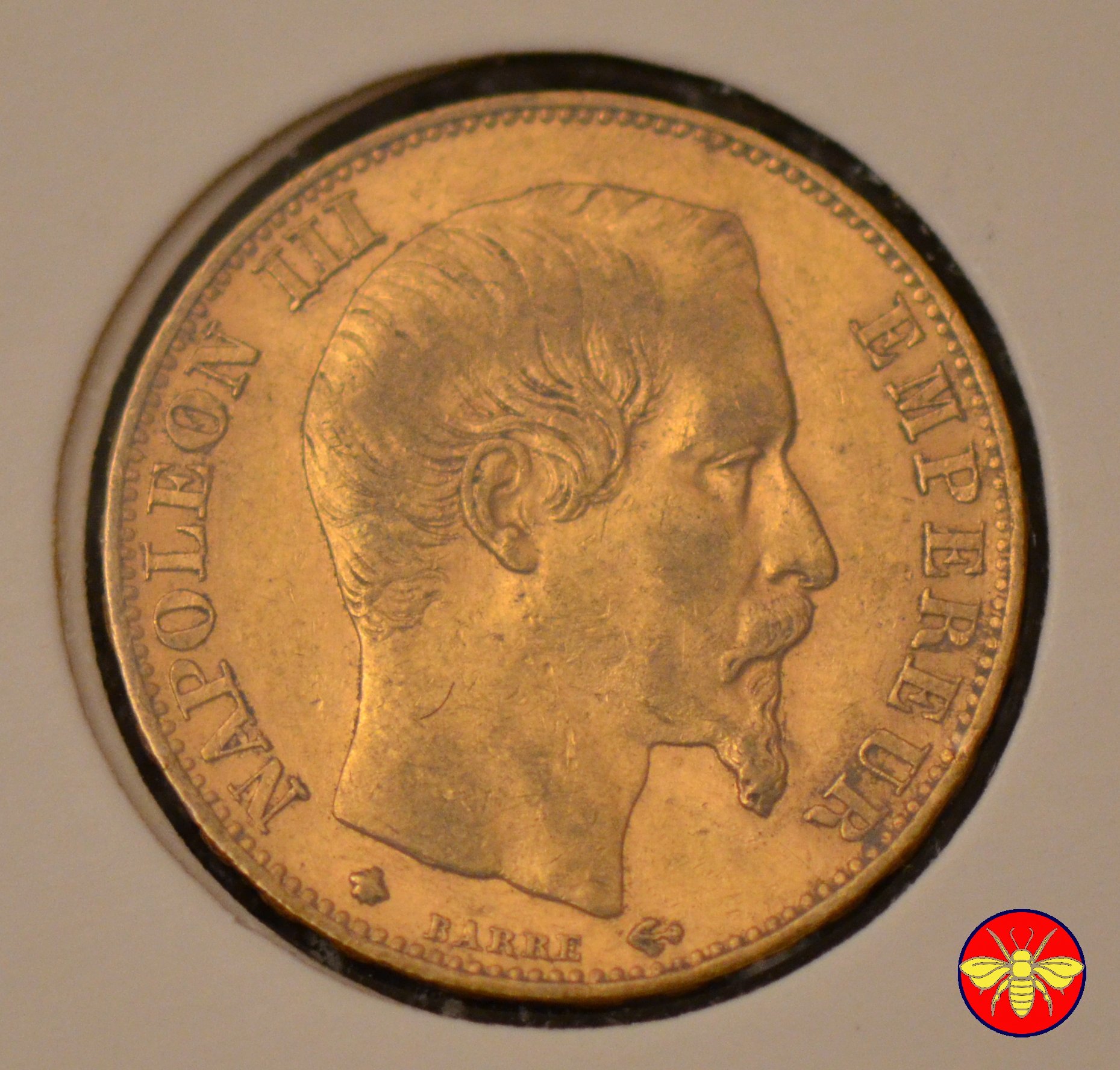 Testa nuda di Napoleone III volta verso destra. 20 FRANCS sopra e millesimo sotto fra rami di Ulivo e Quercia.