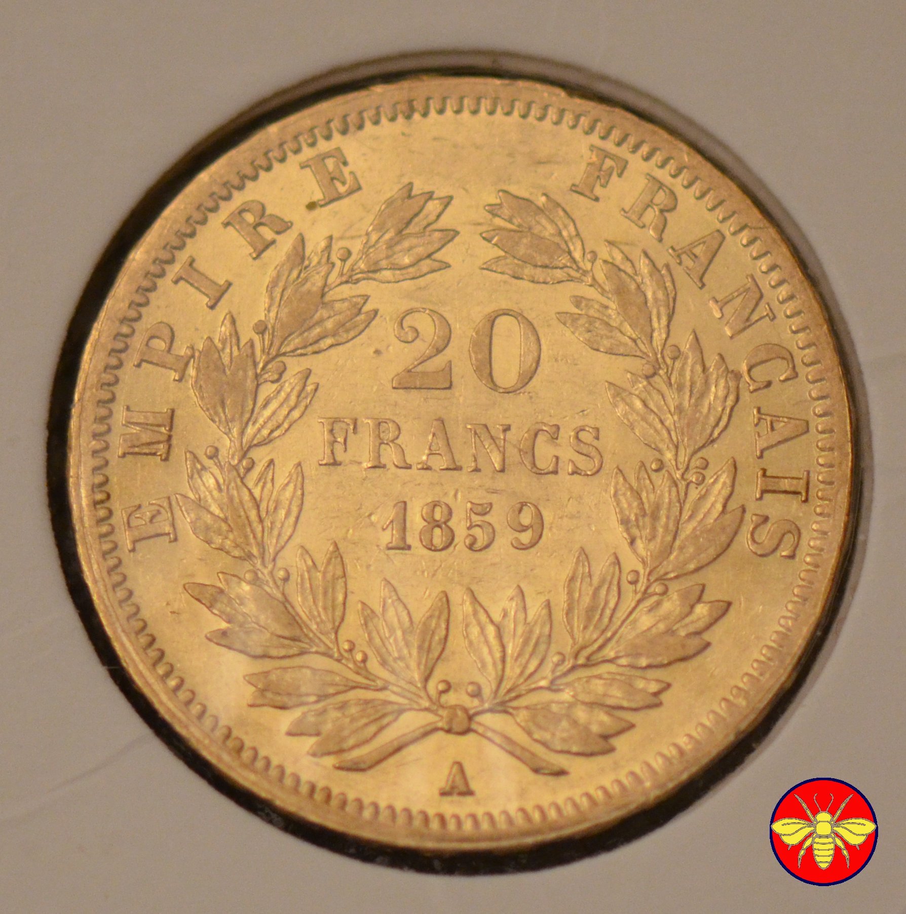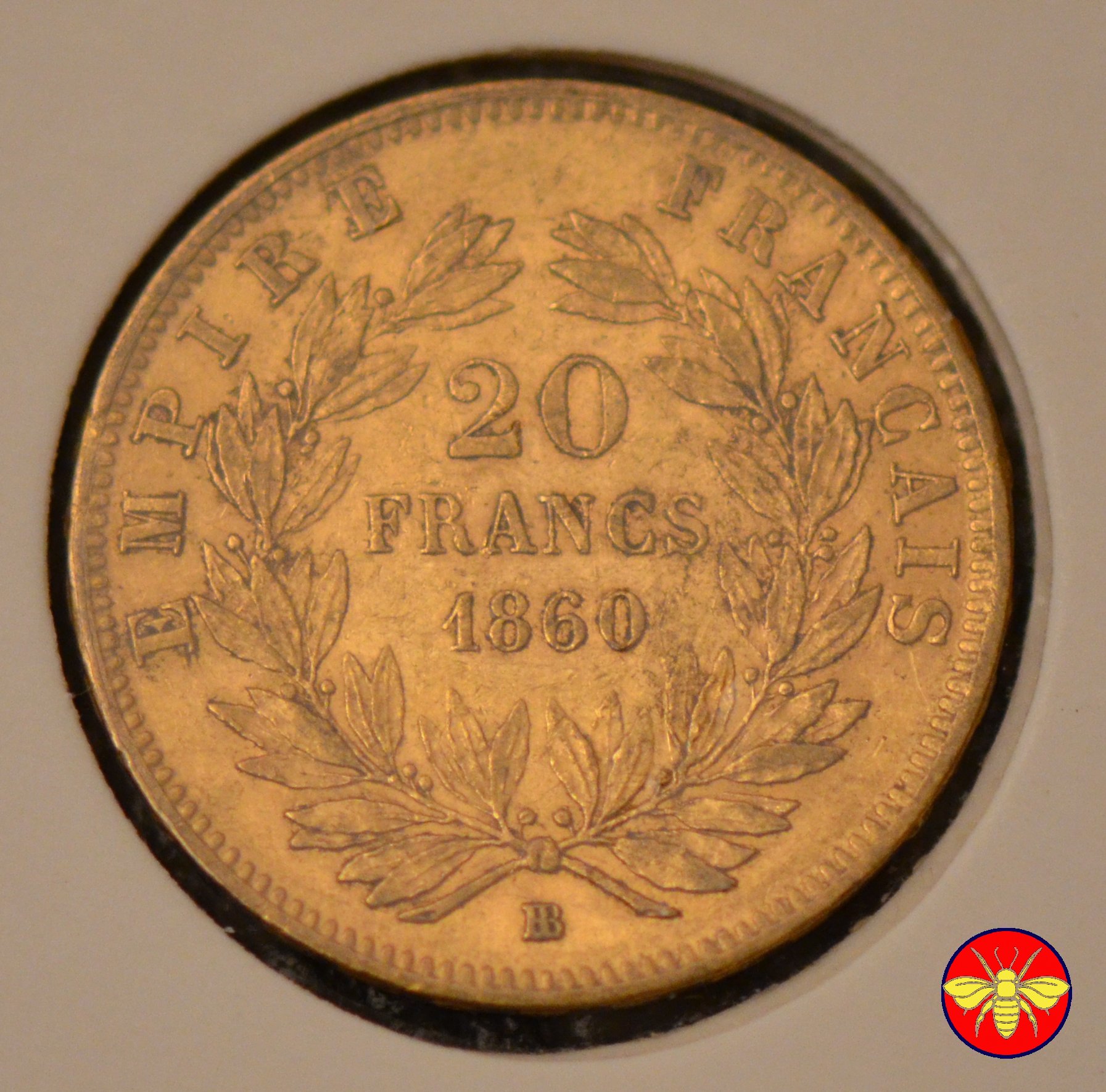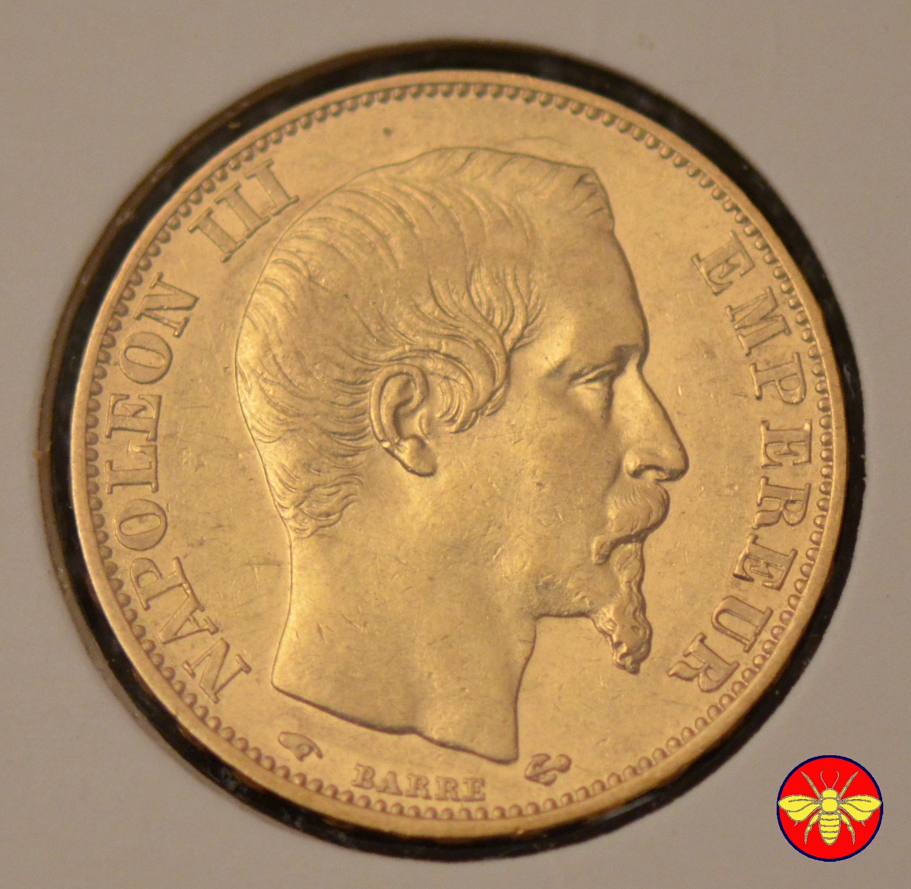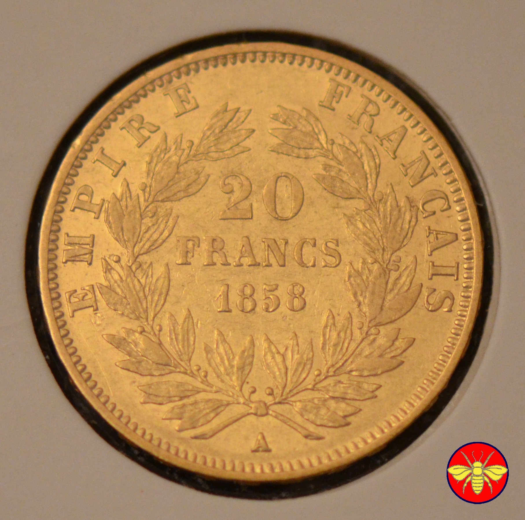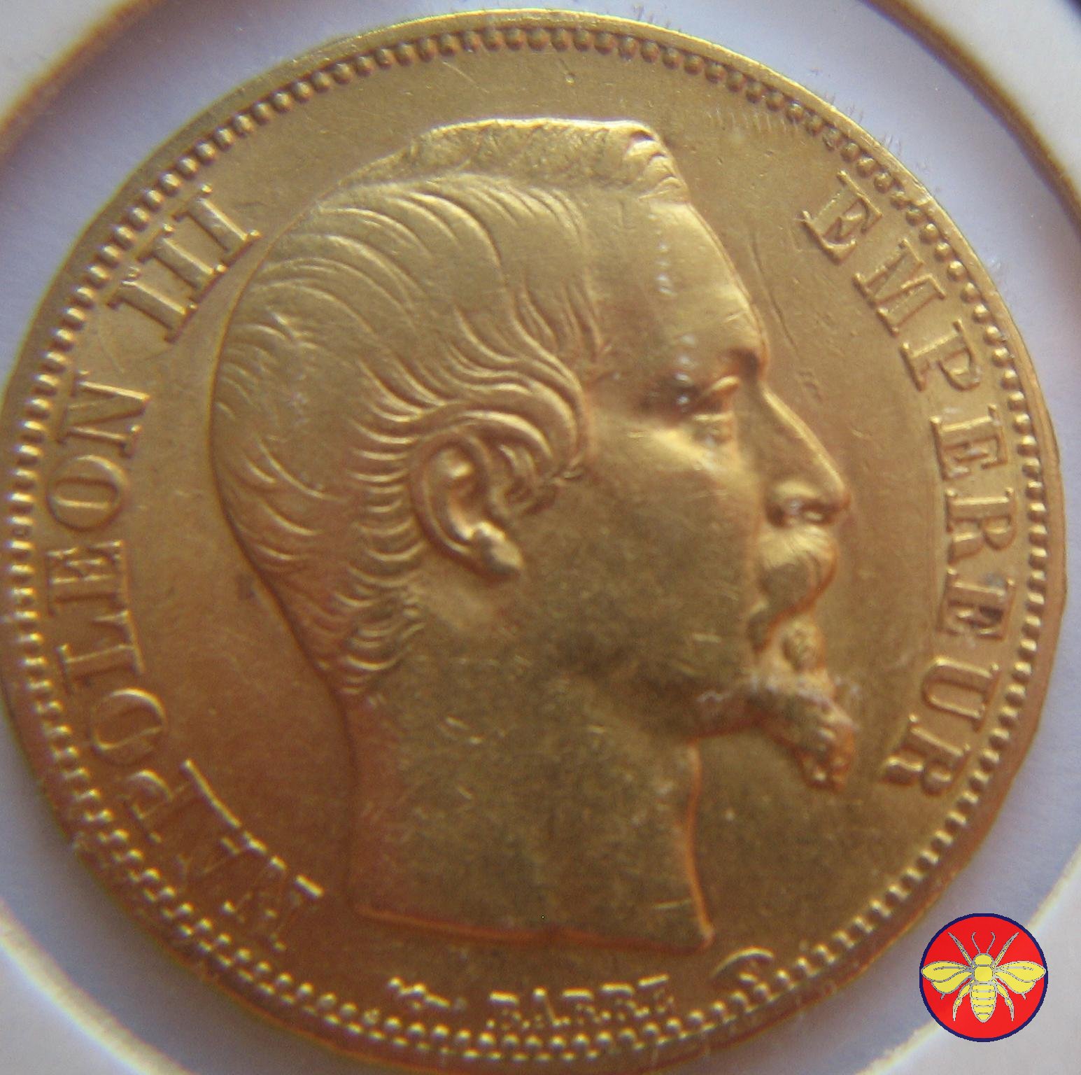 Testa nuda di Napoleone III volta verso destra. 20 FRANCS sopra e millesimo sotto fra rami di Ulivo e Quercia.