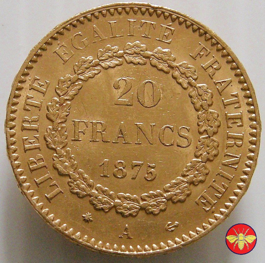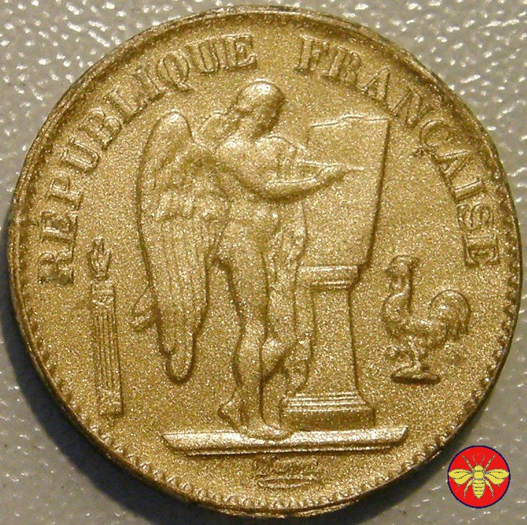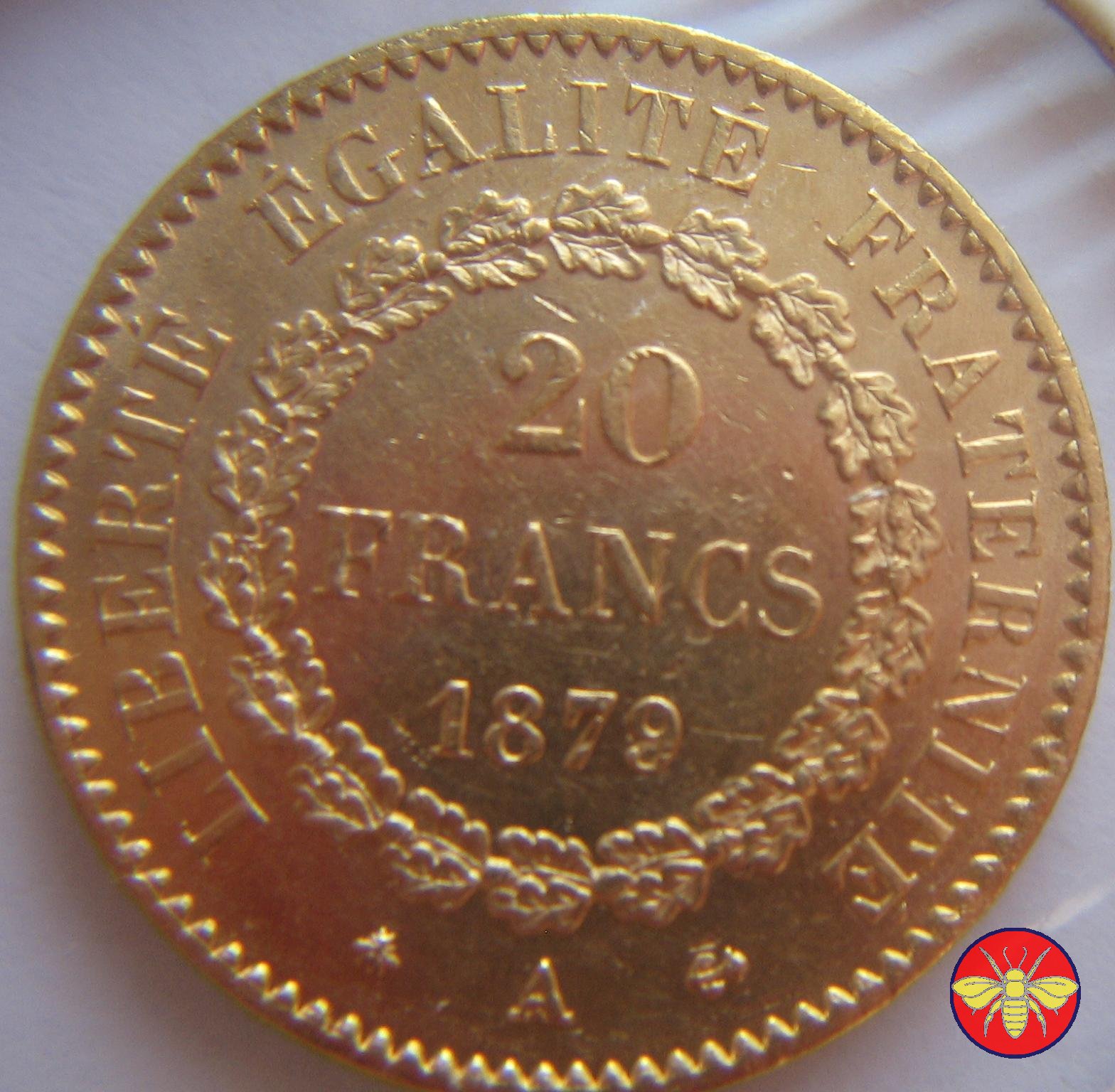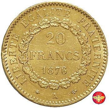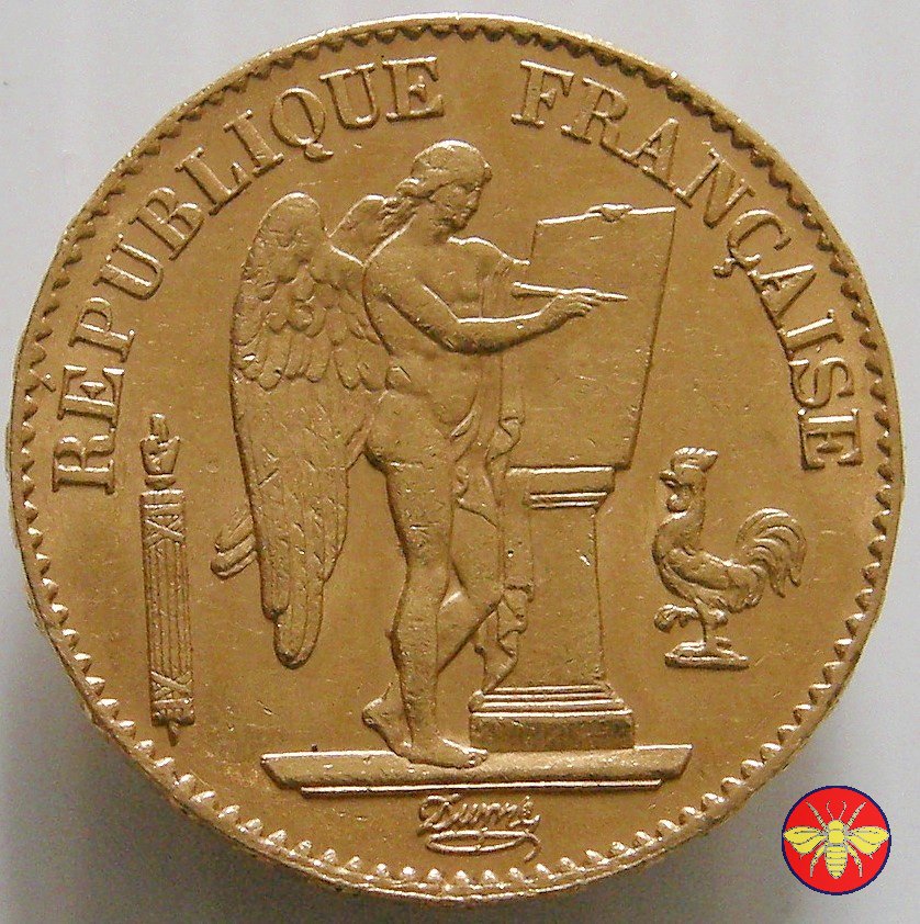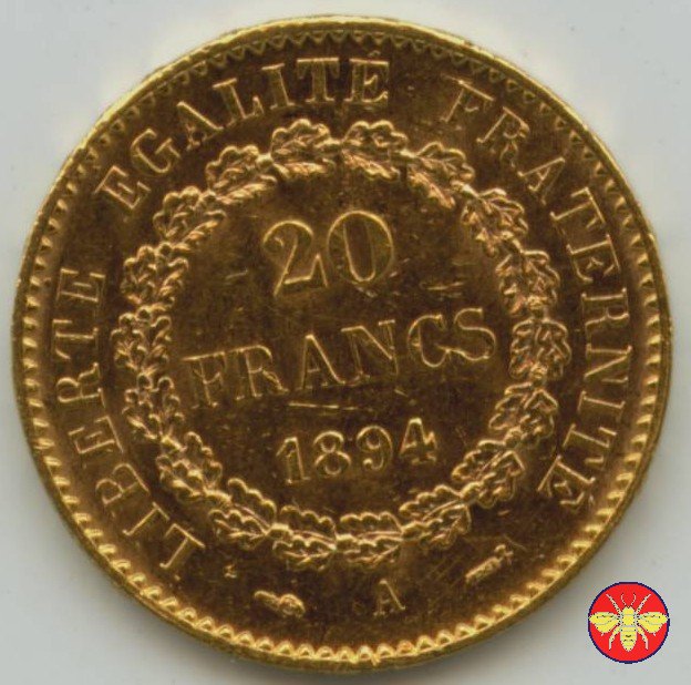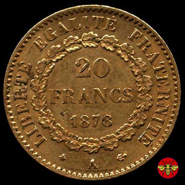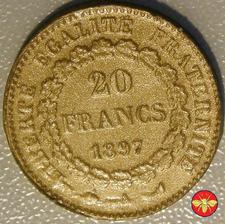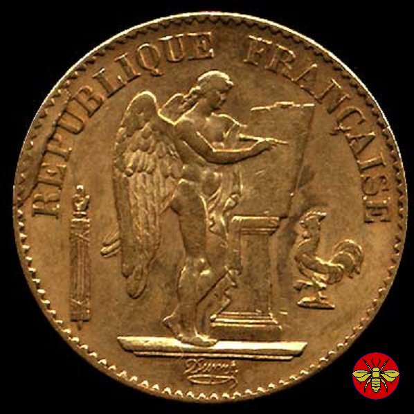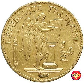 Ritroviamo l'Angelo scrivente ma con la pergamenanon incisa. 20 FRANCS con sotto il millesimo, coronati da rami di Quercia.