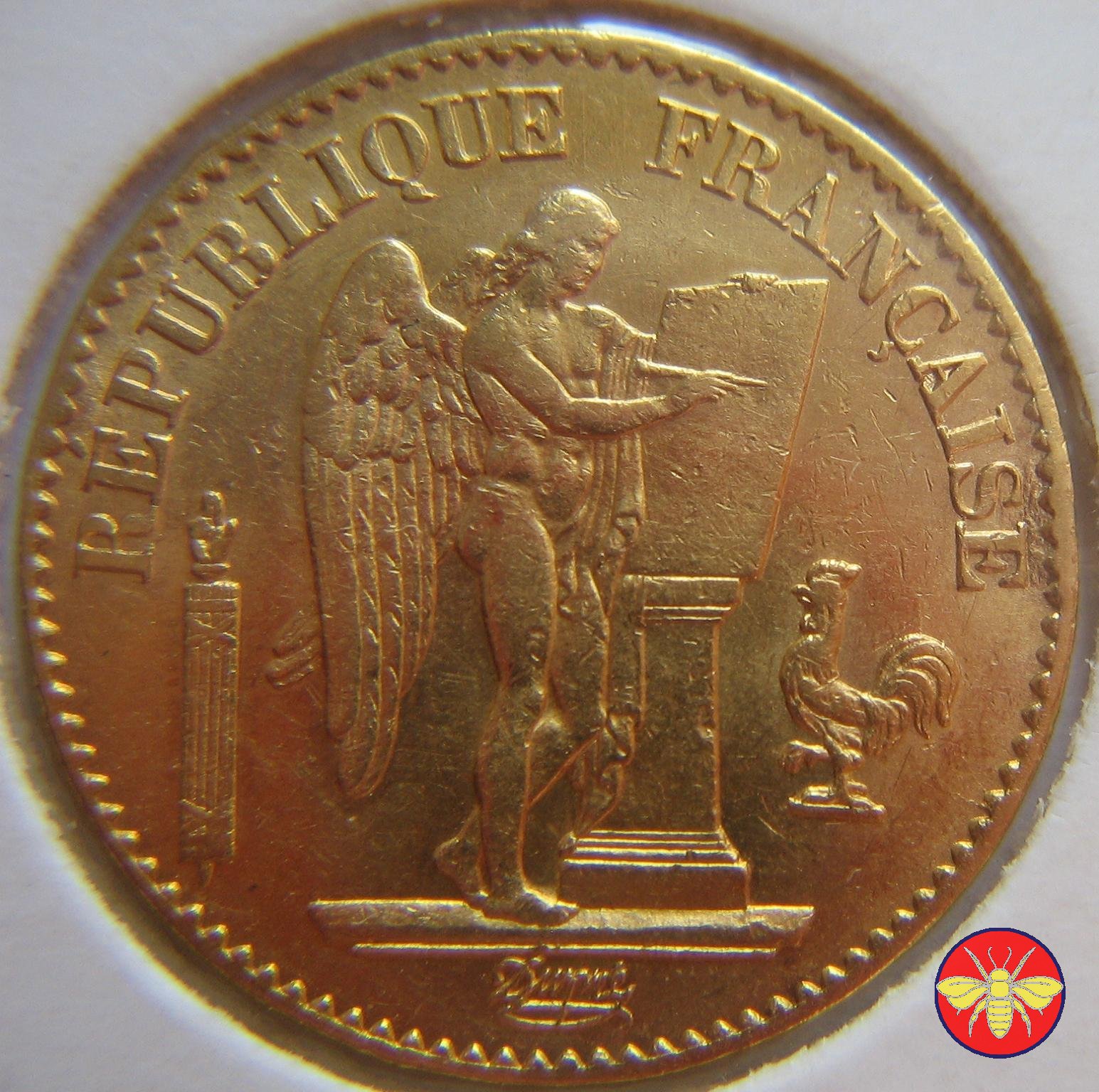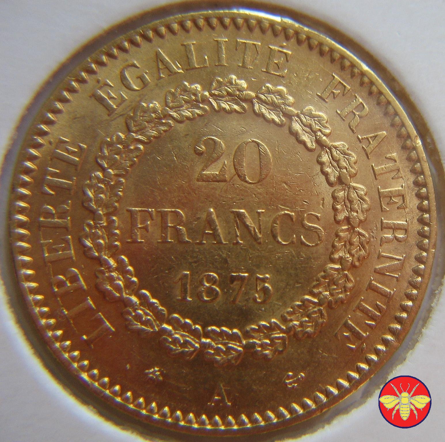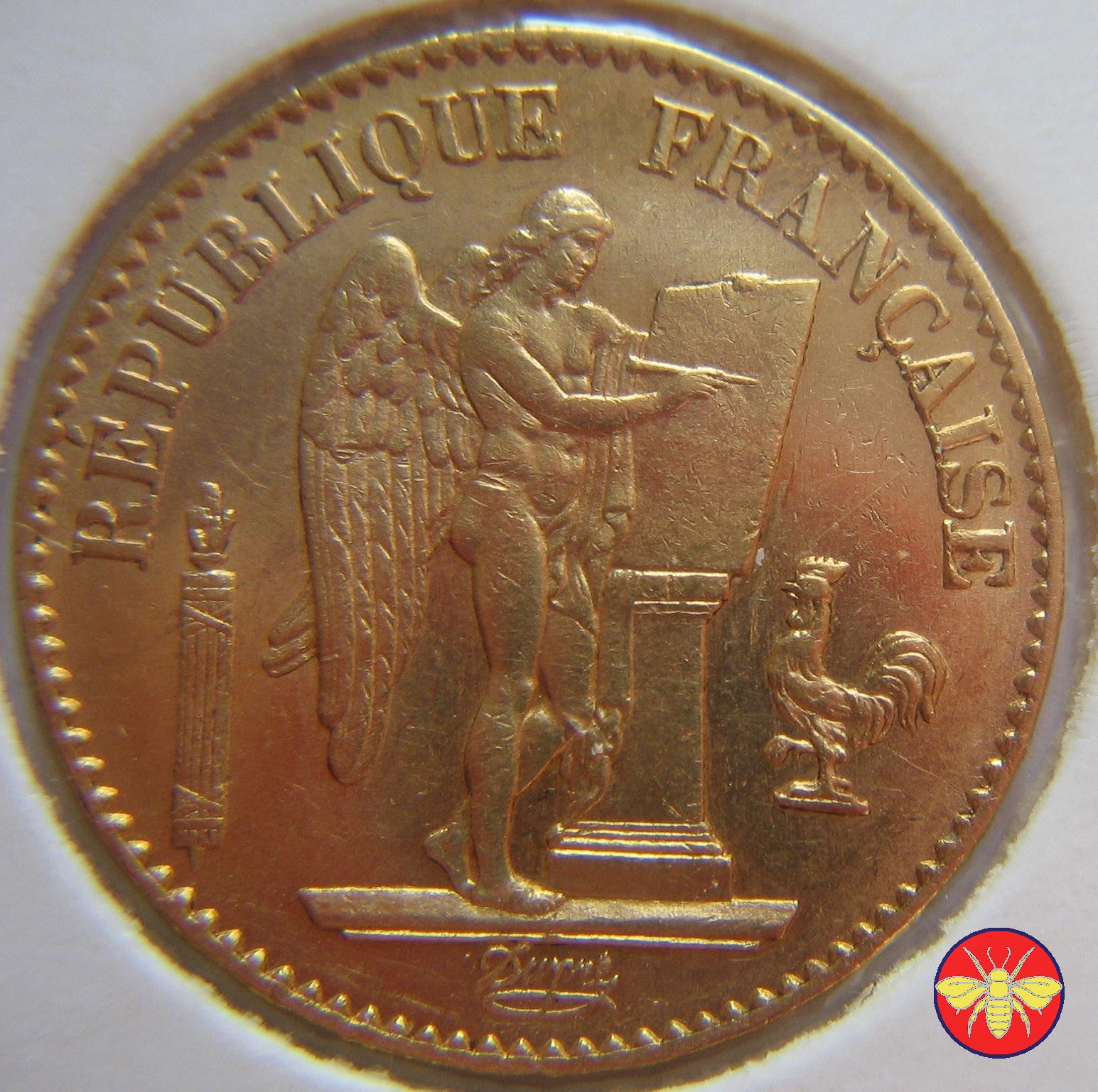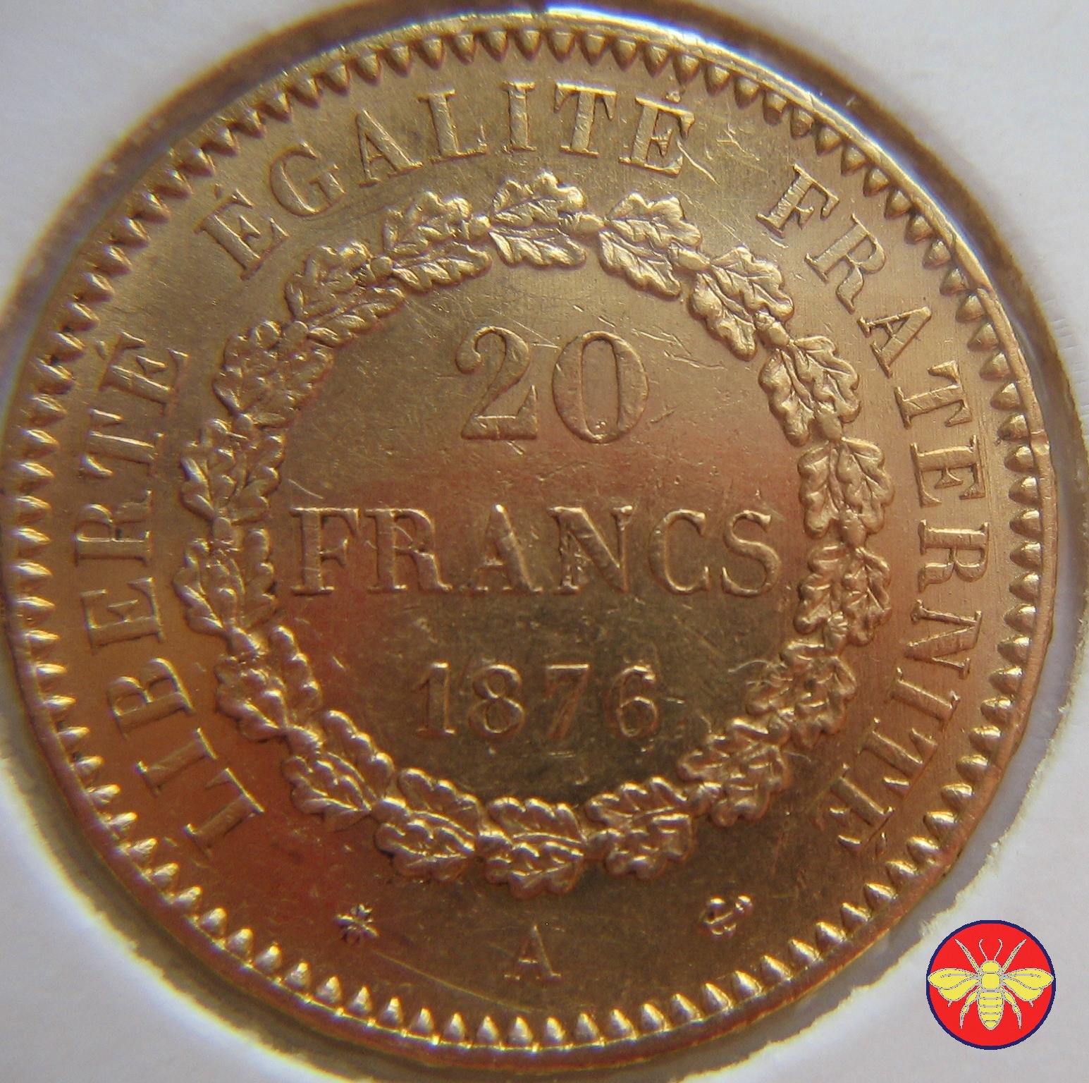 Ritroviamo l'Angelo scrivente ma con la pergamenanon incisa. 20 FRANCS con sotto il millesimo, coronati da rami di Quercia.