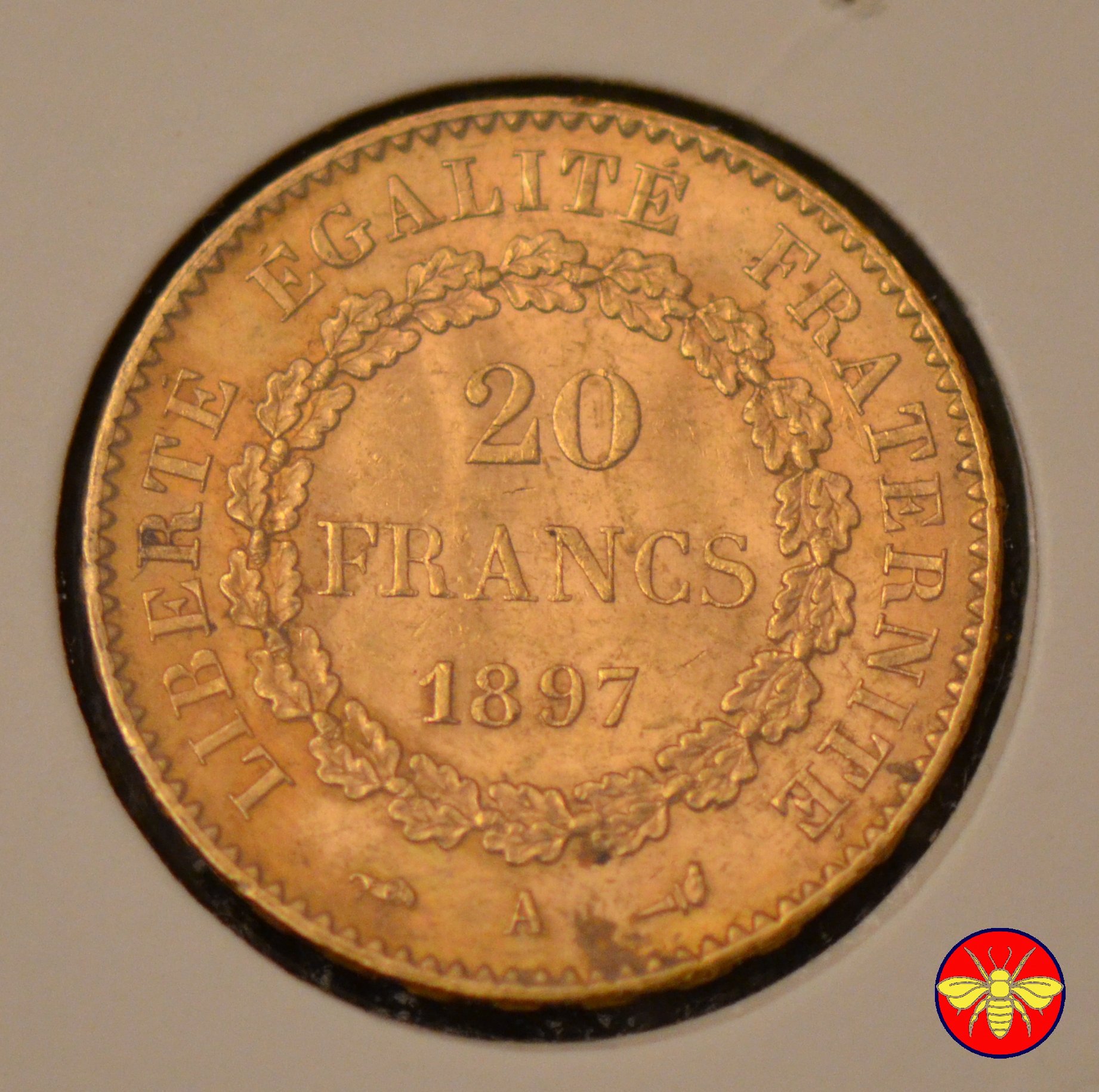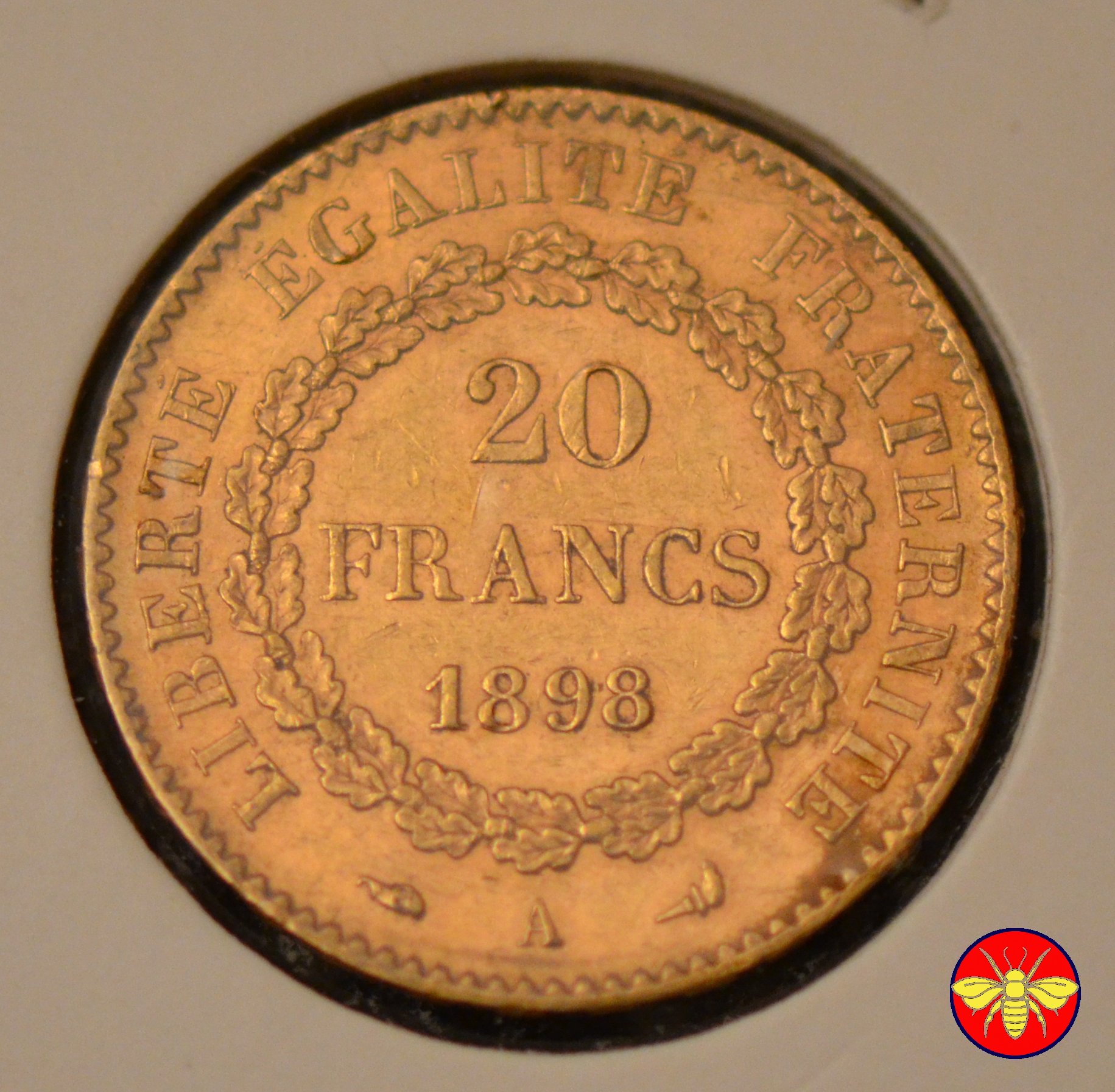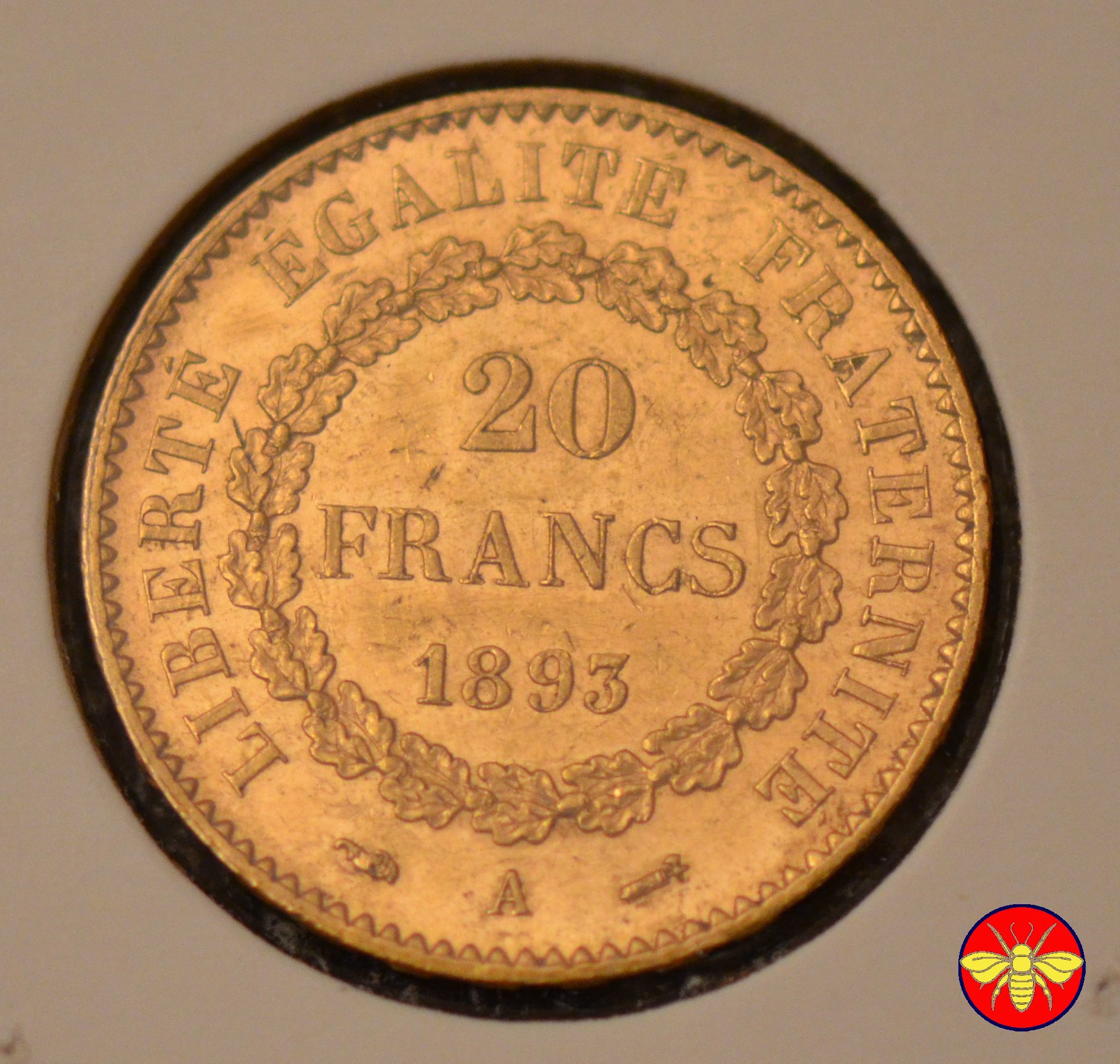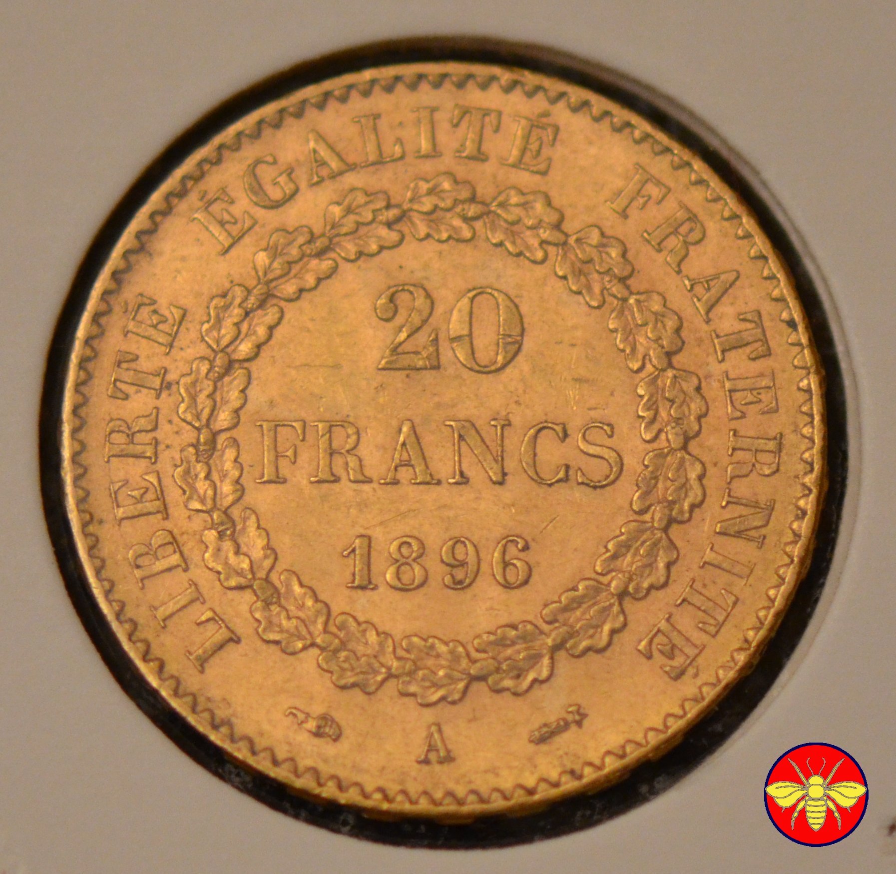 Ritroviamo l'Angelo scrivente ma con la pergamenanon incisa. 20 FRANCS con sotto il millesimo, coronati da rami di Quercia.