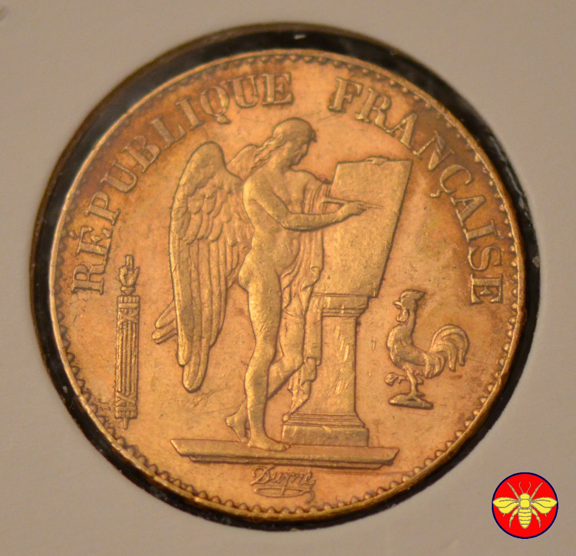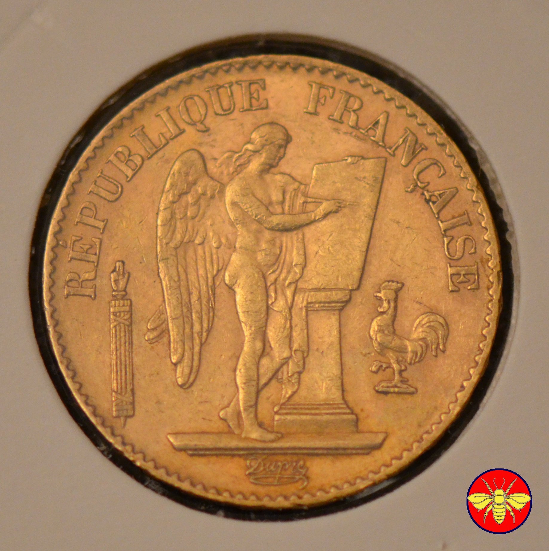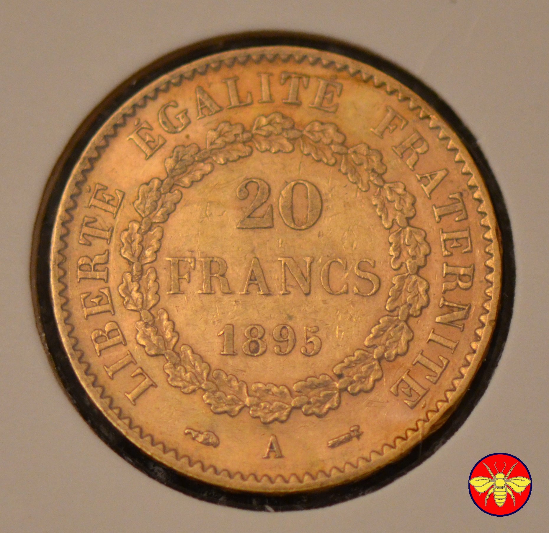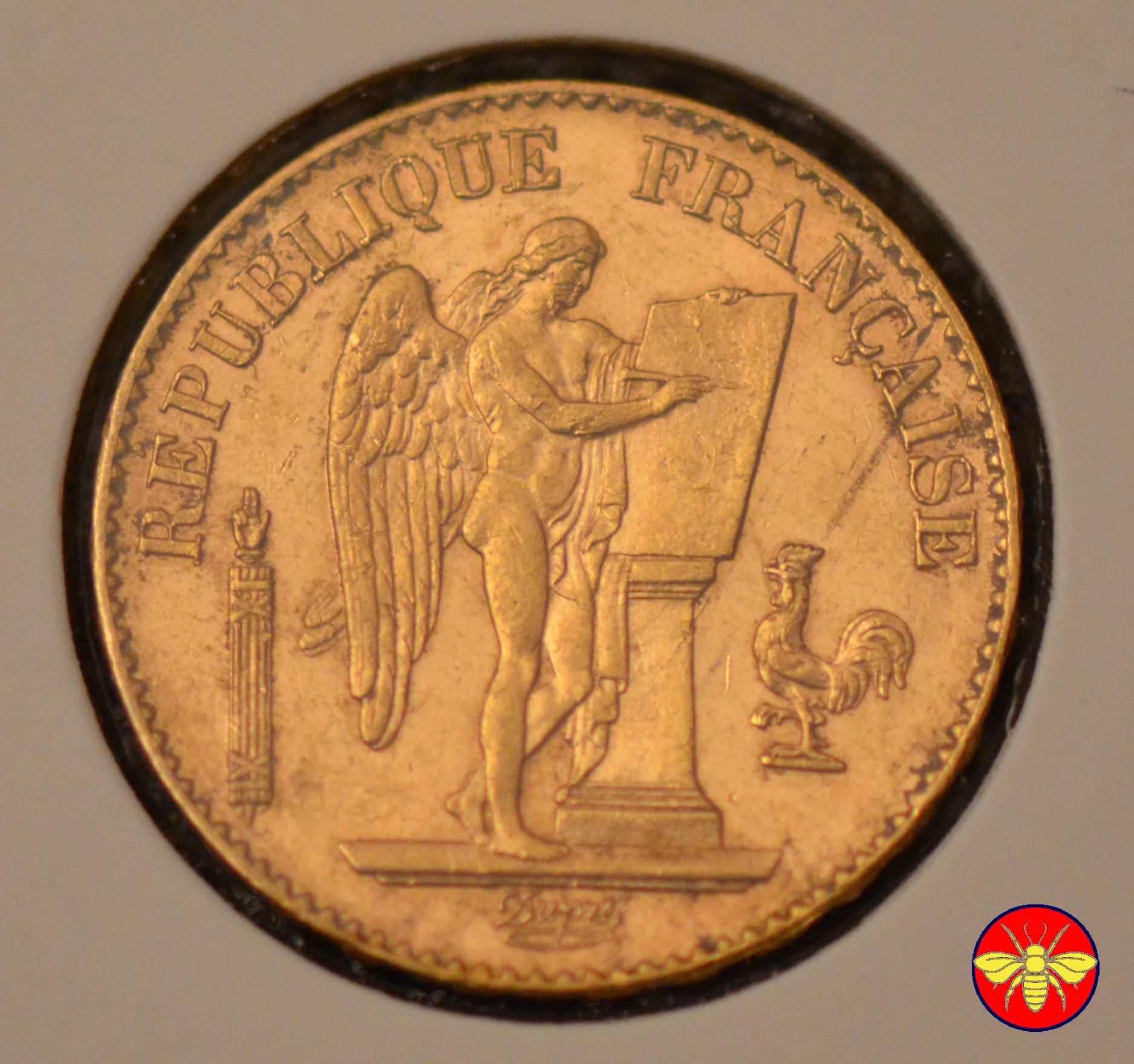 Ritroviamo l'Angelo scrivente ma con la pergamenanon incisa. 20 FRANCS con sotto il millesimo, coronati da rami di Quercia.