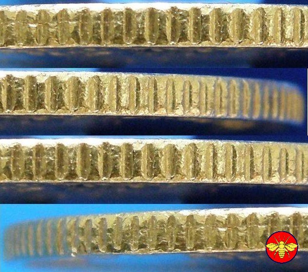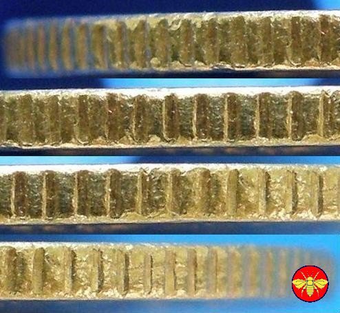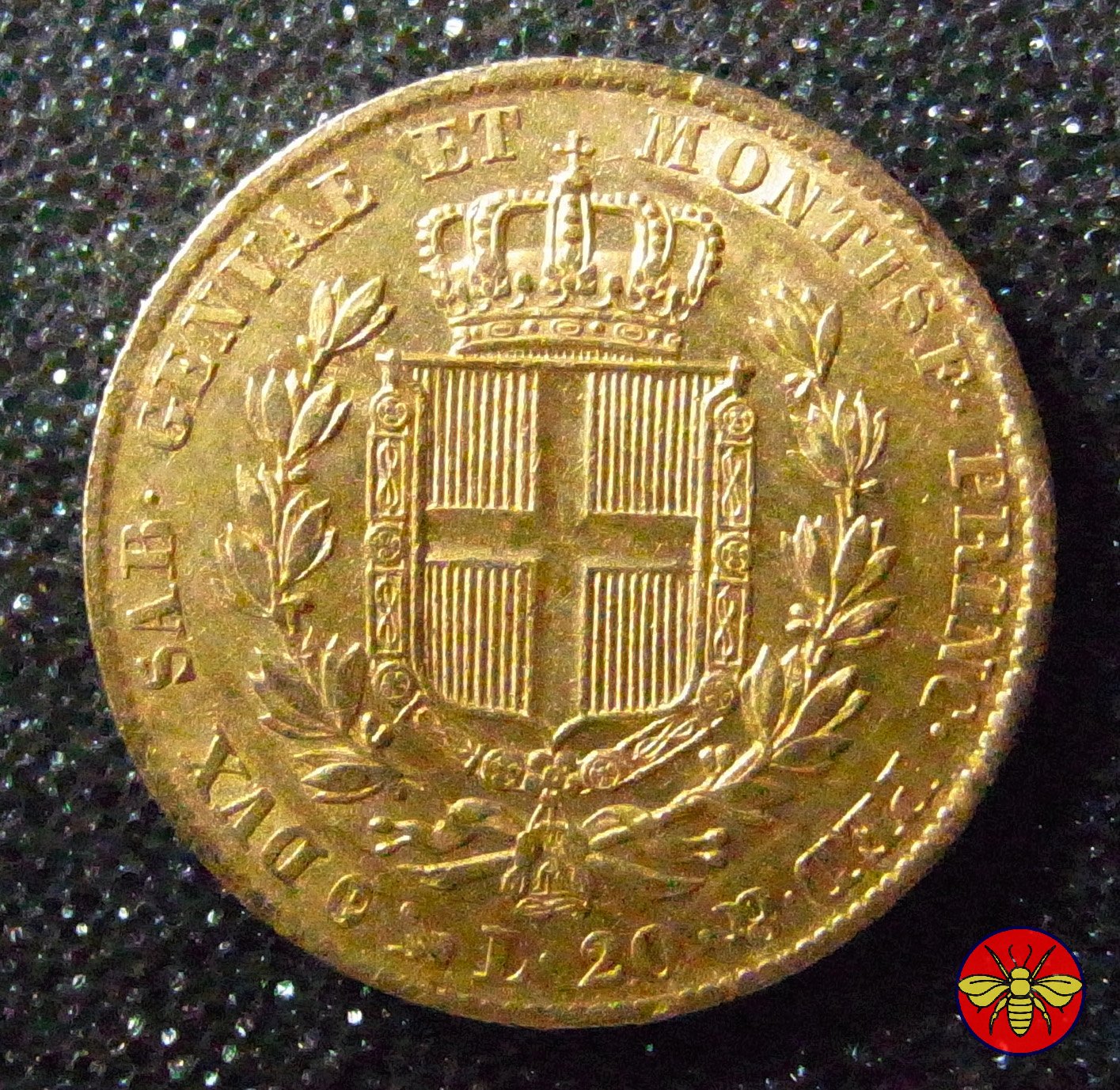 | Segno di zecca per Genova, P in incuso all'interno di un ovale. Segno di zecca per Torino, P in incuso all'interno di un ovale e testa d'aquila. La P è riferibile all'iniziale di cognome del direttore di zecca Luca Podestà. Le monete con contorno in incuso possono presentare uno dei tre "FERT" divenuto "FFRT" oppure "FKRT". Ciò è dovuto alla deformazione/consumazione o anche rottura delle lettere in rilievo presenti nella scanalatura dei cuscinetti presenti nell'orlettatrice rettilinea. Tali errori sono ricercati da alcuni collezionisti e possono raggiungere prezzi superiori a quelli delle monete normali. | |||||||||||||||||||||||