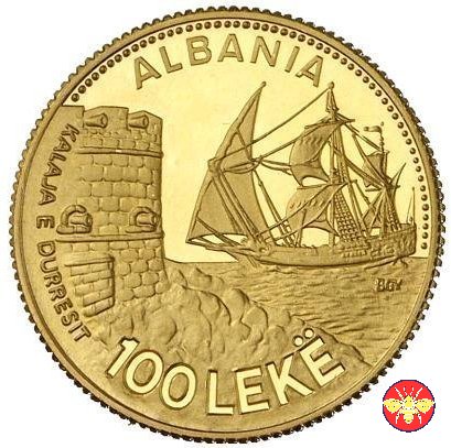 100 Leke Albania Porto marittimo di Durazzo Dritto: Velieri nel porto di Durazzo. Verso: Aquila bicipite fra spighe di grano. | |